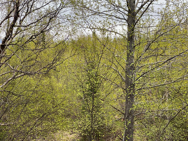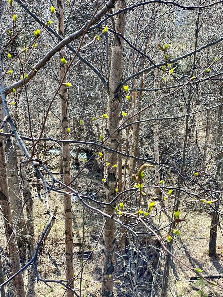 It honestly feels like a miracle each year—that a landscape of bare branches and so much snow and ice and gravel can slowly turn again into one that is showy with aliveness. That it might all still not happen. The winds have been gusting more than usual this past week, and each gust is a worry that the buds might change their mind, might be blown off and we will inevitably have to return to winter. But these are steady, determined leaves. It is finally, slowly their time of year.
