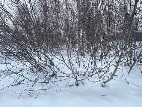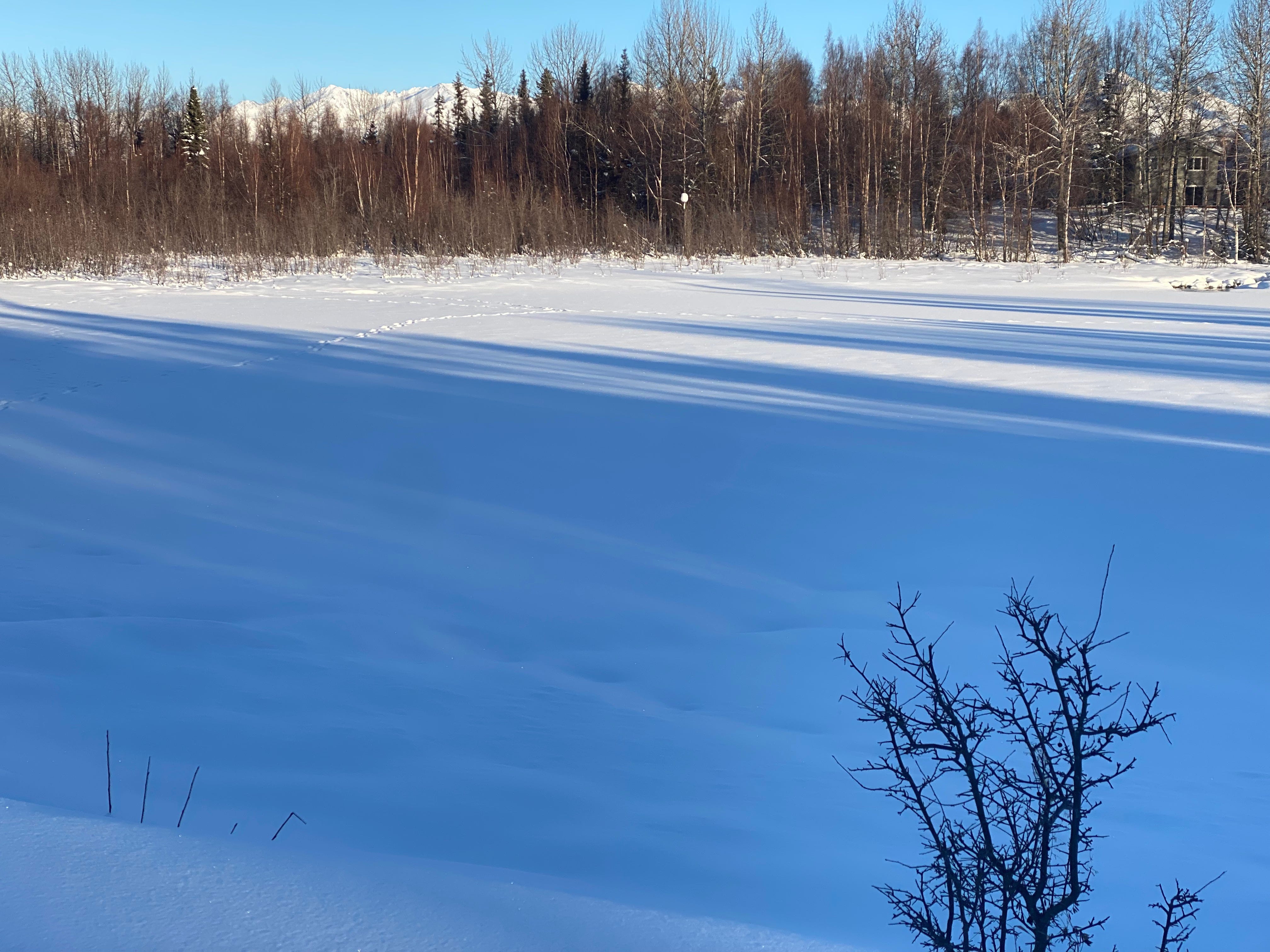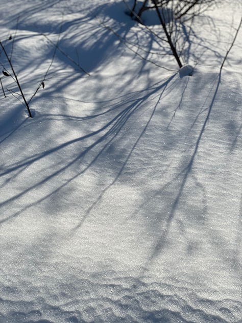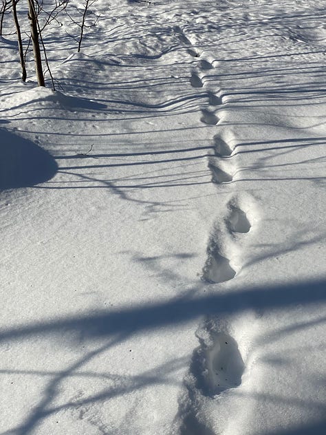 I walk the same route most days with my dog, around a pond that lives amidst our neighborhood. I like the routine of it. Keeping familiarity with one route, the scope of focus becomes much smaller. I watch the level of the snow as it begins to melt and refreeze each day and night, notice the newly moose-browsed tree limbs, birds that occasionally come in abundance or are moving through. Drifts of snow moved back and forth by the wind, narrowing the path. And the many, many tracks that appear each day, a witness to the aliveness of many creatures spending time in the same place over the winter, or fresh from the night before. Boot tracks, fox, otter, moose (lots of moose), magpie, dogs. Tracks of former presence.
